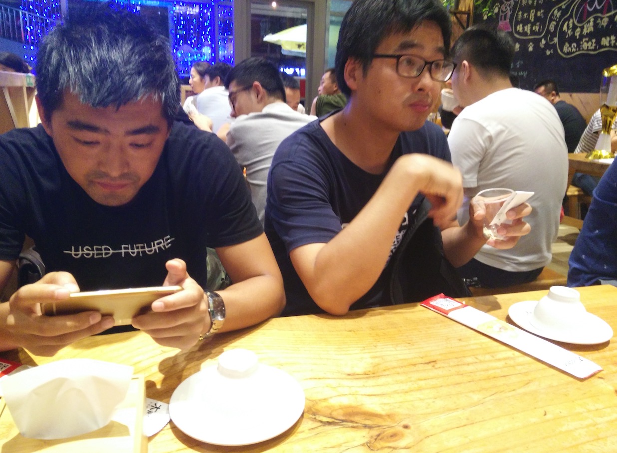 于是我们来到一家人气爆棚的烧烤店(左边设计小哥,右边老张)